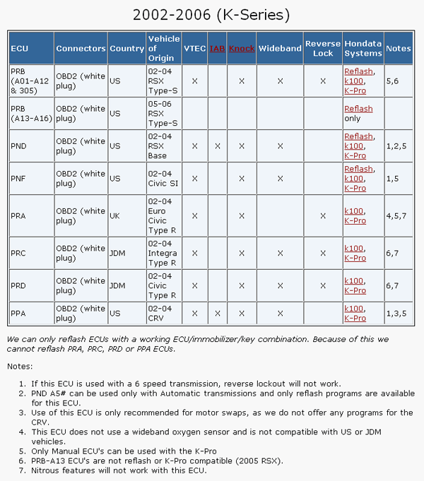 The K-Pro ECU is a specially modified 2002 to 2004 Honda ECU with a USB interface to a notebook PC running Windows. It is currently available for the standard shift Acura RSX base model and Type-S, the US Civic Si and the Euro Civic Type R. K-Pro ECU Manager software allows the setting of cam angle, ignition advance, fuel, and a variety of other aspects. The purpose of the K-Pro ECU is to fine-tune the Honda ECU for the best possible engine performance under various operating conditions and with various engine configurations. It also allows you to disable the immobilizer which is particularly important to those people performing engine swaps.