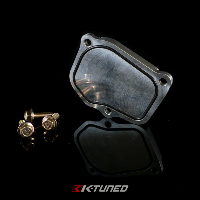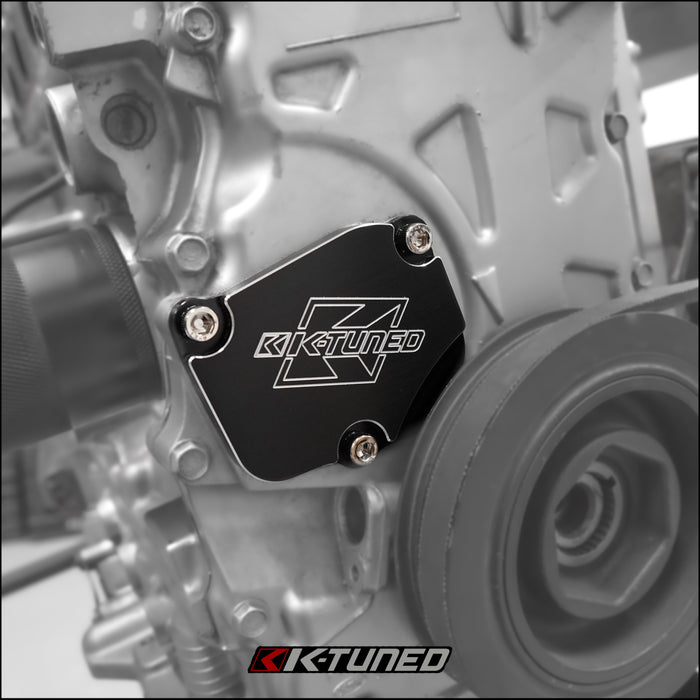The K-Tuned Tensioner Cover Plate is machined from raw 6061 billet aluminum and comes ready to install with new hardware. To install it, remove the oem black cover and clean off all the sealer from the mounting surface for the last time. A razor blade followed by a green scotch brite pad and brake cleaner works well. After that, our bolt on plate can be installed and removed repeatedly with no sealer required.