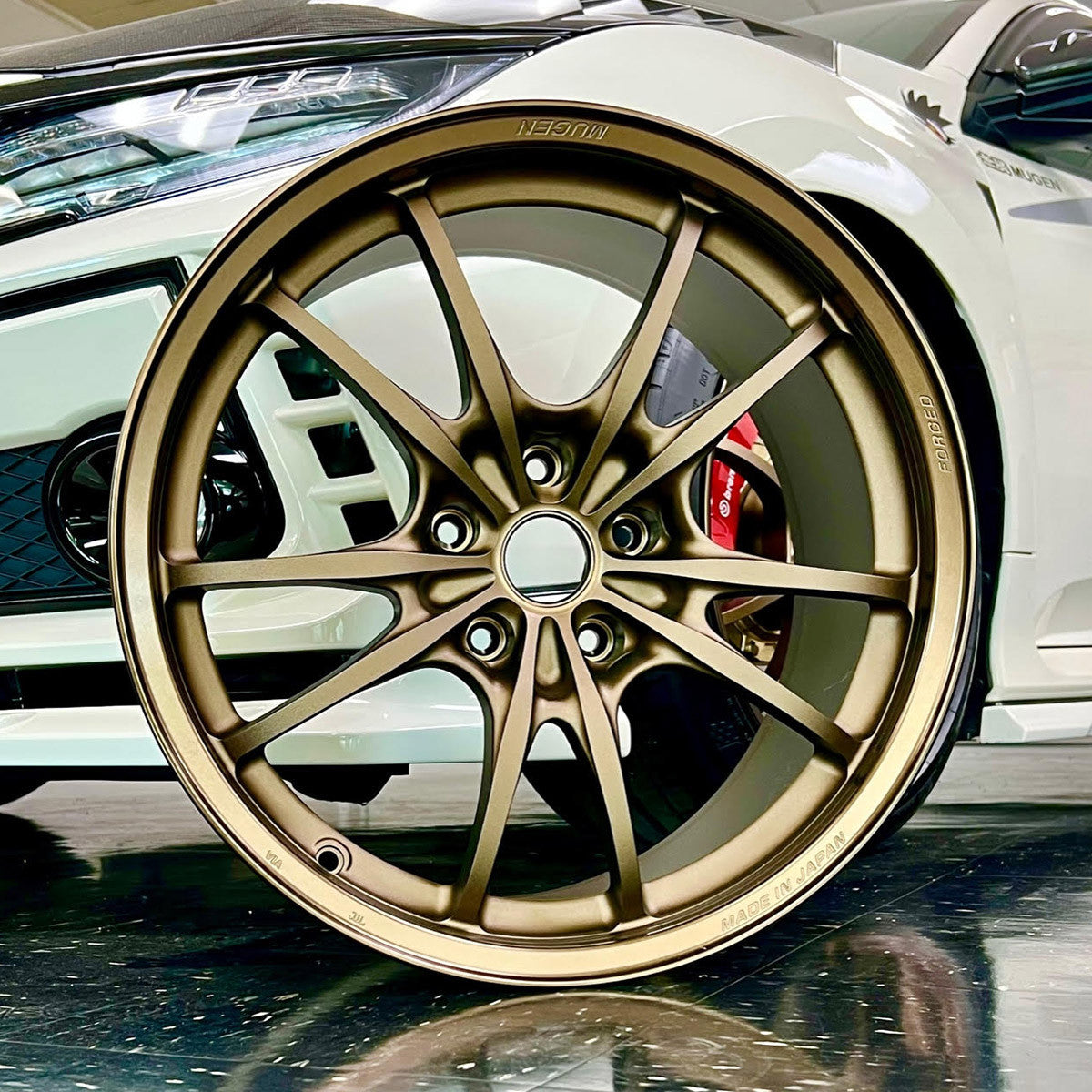 A new King Motorsports exclusive! The iconic MF10 wheel in 18 x 9.5 +45 offset 5x120mm bolt pattern spec for the FK8/FL5 Civic Type R. Forged construction that is strong, durable and light weight. Each wheels is supplied with a black Mugen valve stem. Impeccable bronze anodized finish. Simply put, a show stopper!