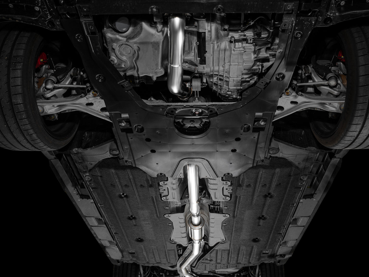 This frontpipe is integrated into the design of the exhausts, and will mate to aftermarket downpipes as well as the factory downpipe.