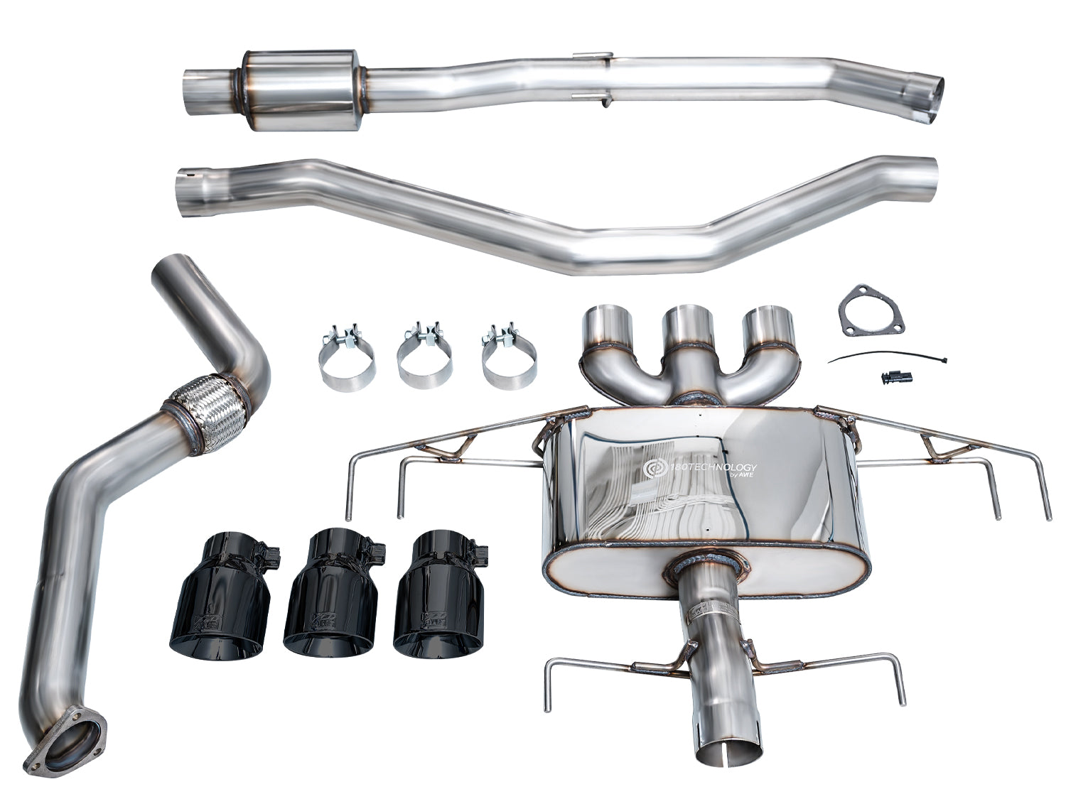 Complete AWE Touring or Track Edition Catback Exhaust, gasket, dust cover for factory valve plug, three 4.5” slash-cut double-walled tips in chosen finish, and all necessary hardware for installation.