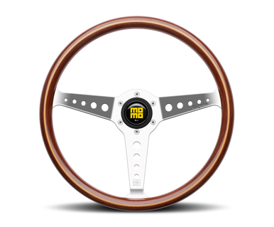 The MOMO California Wood Heritage Steering Wheel brings artisan level mahogany wood to a classis wheel and delivers a pleasurable driving experience and period-correct look, featuring: Diameter: 360mm Dish: 34mm Polished 3-Spoke Design with "California" Engraving Ergonomic Back Finger Grooves Mahogany Wood Horn Button Color: Heritage Yellow